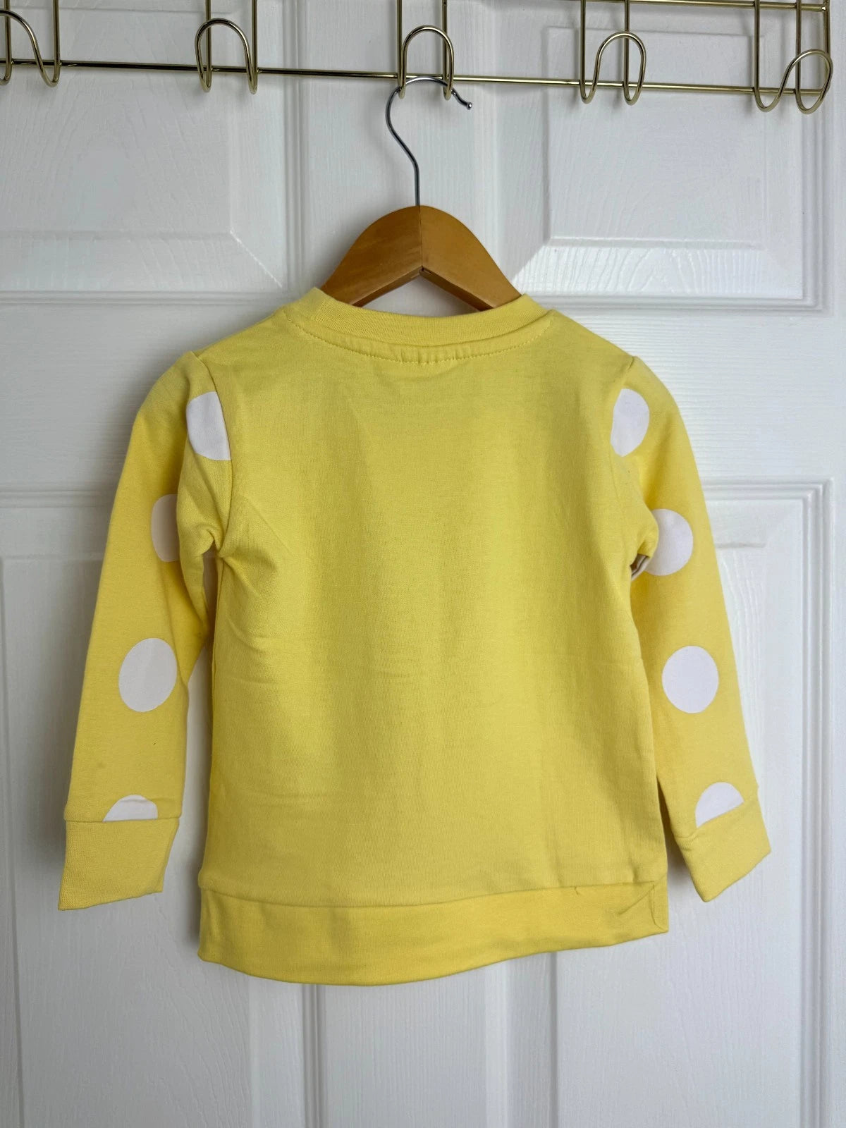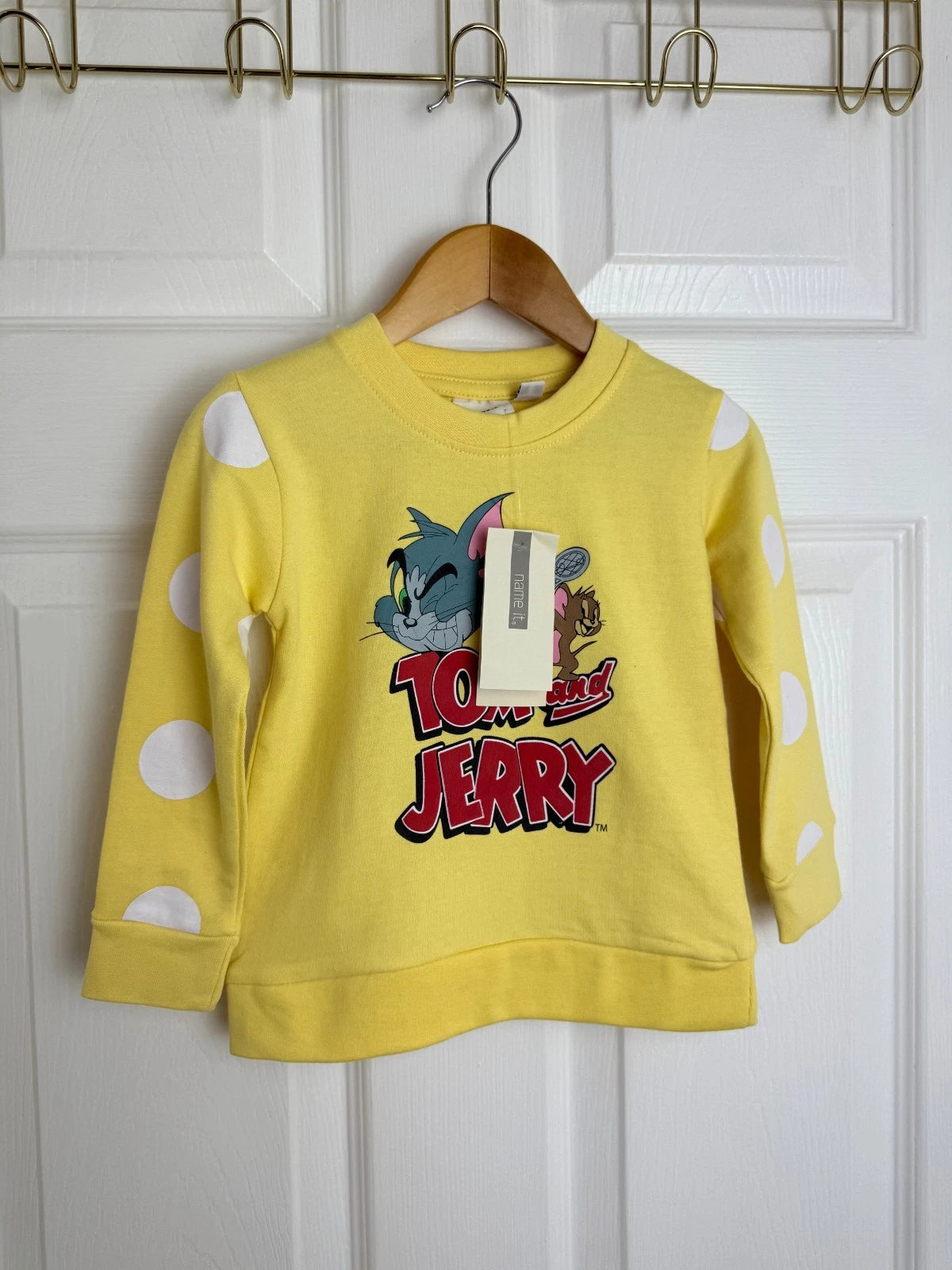 Brand new Name It Tom and Jerry pullover sweater, perfect for little fans of the classic cartoon. This bright yellow sweatshirt features a fun Tom and Jerry graphic on the front, with playful white polka-dot detailing on the sleeves. Made from a soft, comfortable fabric, it’s ideal for everyday wear, playtime, or casual outings.